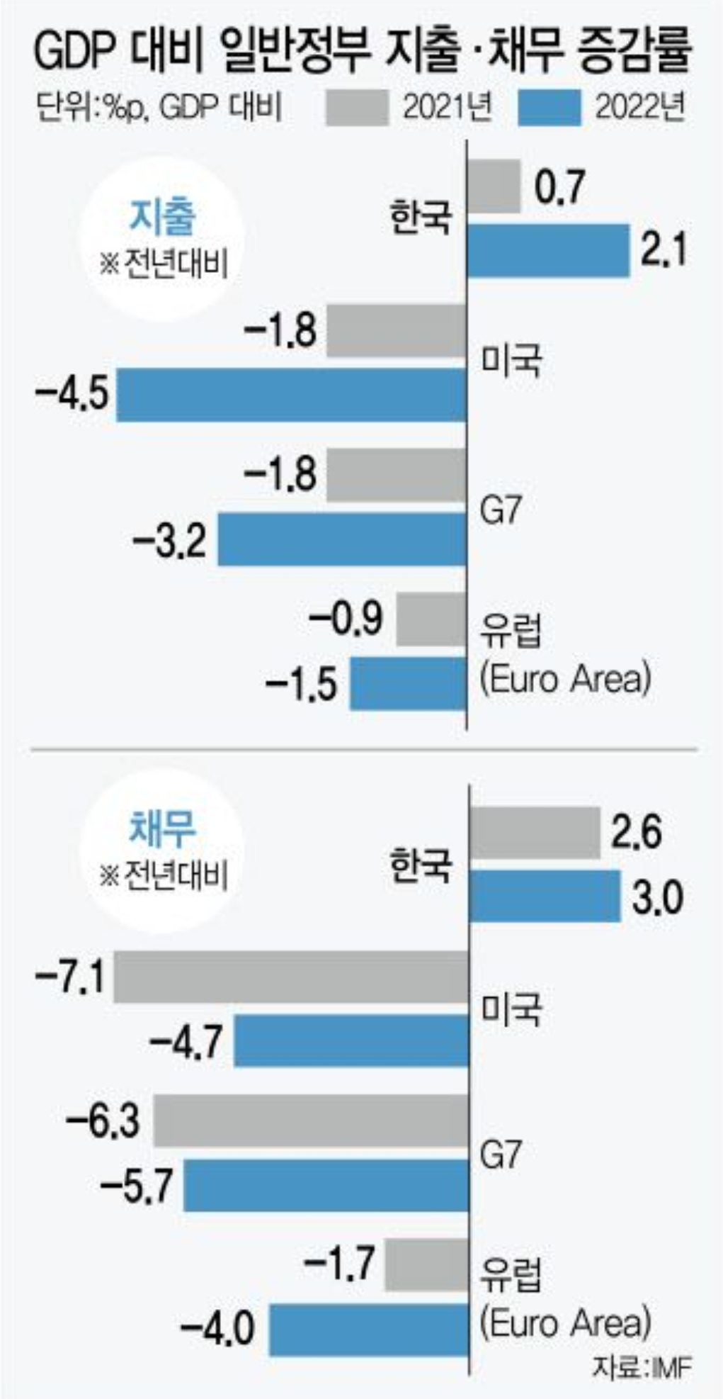 내가 지난 정부에 있어 가장 부정적이었던 것 중 하나가 바로 이 부분입니다. 사실 미국이 코로나 때 돈을 많이 찍어내긴 했지만 미국은 기축통화국이고, 또한 자료에 보면 나오듯이 이후에는 재정지출을 절대적 축소하였는데 우리나라는 돈을 펑펑 써 댔으니 그 참... 거시기하네요...ㅜㅠ