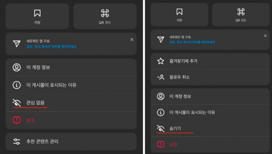 인스타그램도 유튜브와 마찬가지입니다. 인스타그램 고객센터 페이지를 보면 탐색 탭에 대한 설명이 올라와 있습니다. 여기에는 원치 않는 게시물을 숨길 수 있는 방법을 소개하고 있는데, 해당 방법을 통해 관련 게시물이 ’ 적게’ 표시되도록 선택할 수 있다고 설명하고 있습니다. 즉, 메타가 제공하는 방법을 사용해도 빈도가 줄어들 뿐 아예 표시되지 않는 건 아니라는 걸 유추할 수 있습니다.