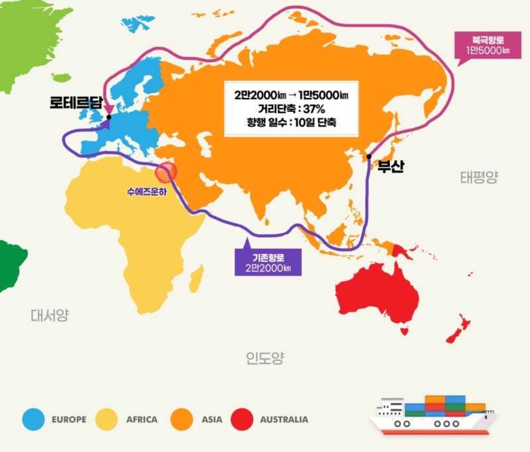 사실 북극항로는 지구의 온난화로 인해 얻게 된 부산물입니다. 워낙 춥다 보니 한해의 절반이상이 얼음으로 뒤덮인 북극항로가 지구의 온난화로 인해 러시아를 돌아 유럽으로 가는 항로가 열리게 되었습니다.