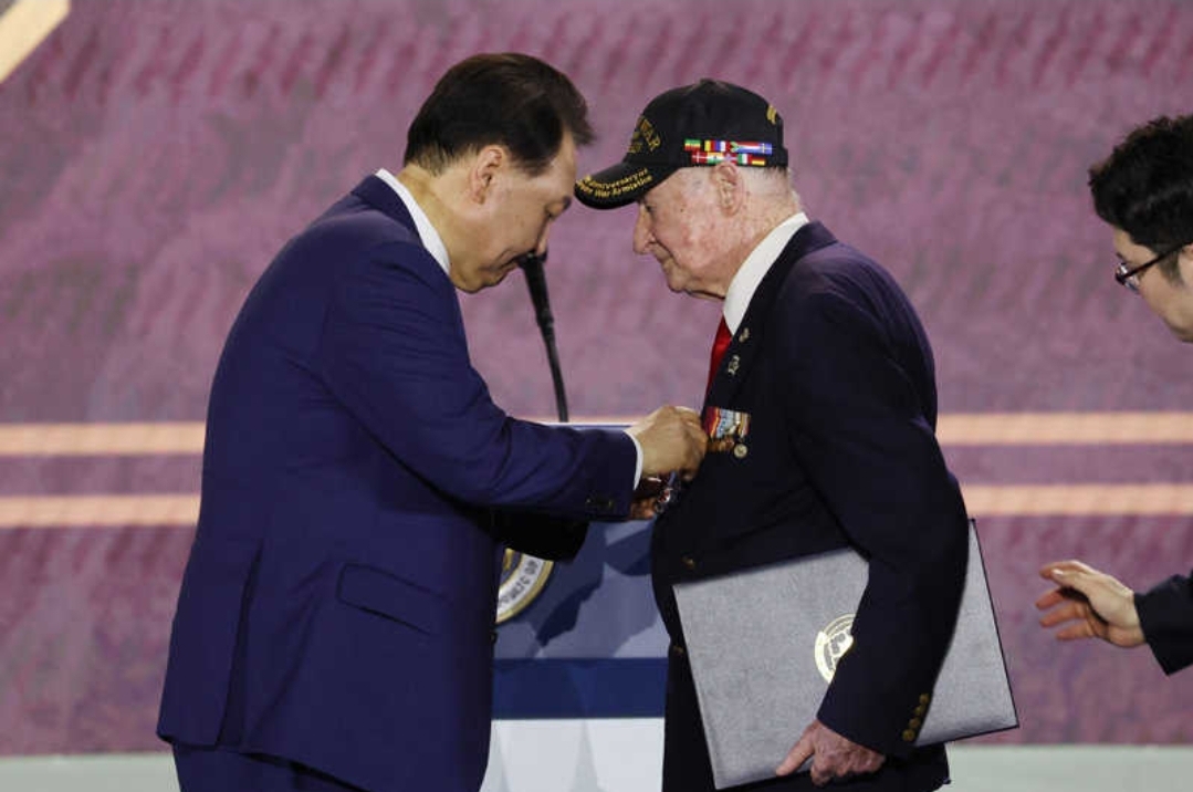 윤석열 대통령이 27일 정전협정 70주년 행사에서 유엔군 참전용사 62명을 최고 예우로 영접했다. 한국전 참전 기념비 건립에 기여한 호주⸱미국인 참전용사에게는 정부 포상을 수여했다. 영국인