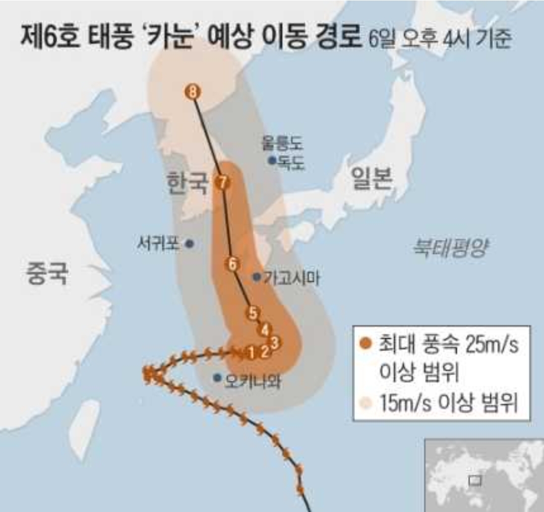 참고로, 기상청에 따르면, ‘카눈’은 6일 오후 4시 기준 일본 오키나와 북동쪽 240㎞ 해상에서 중심기압 970 hPa(헥토파스칼), 최대풍속 초속 35m, 강도 ‘강’ 상태로 동진 중입니다.