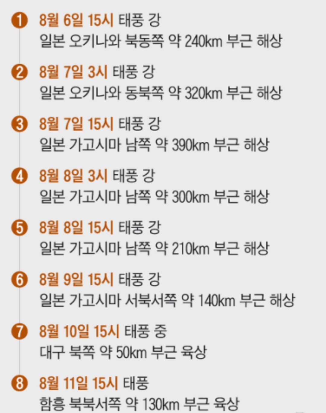 참고로, 기상청에 따르면, ‘카눈’은 6일 오후 4시 기준 일본 오키나와 북동쪽 240㎞ 해상에서 중심기압 970 hPa(헥토파스칼), 최대풍속 초속 35m, 강도 ‘강’ 상태로 동진 중입니다.