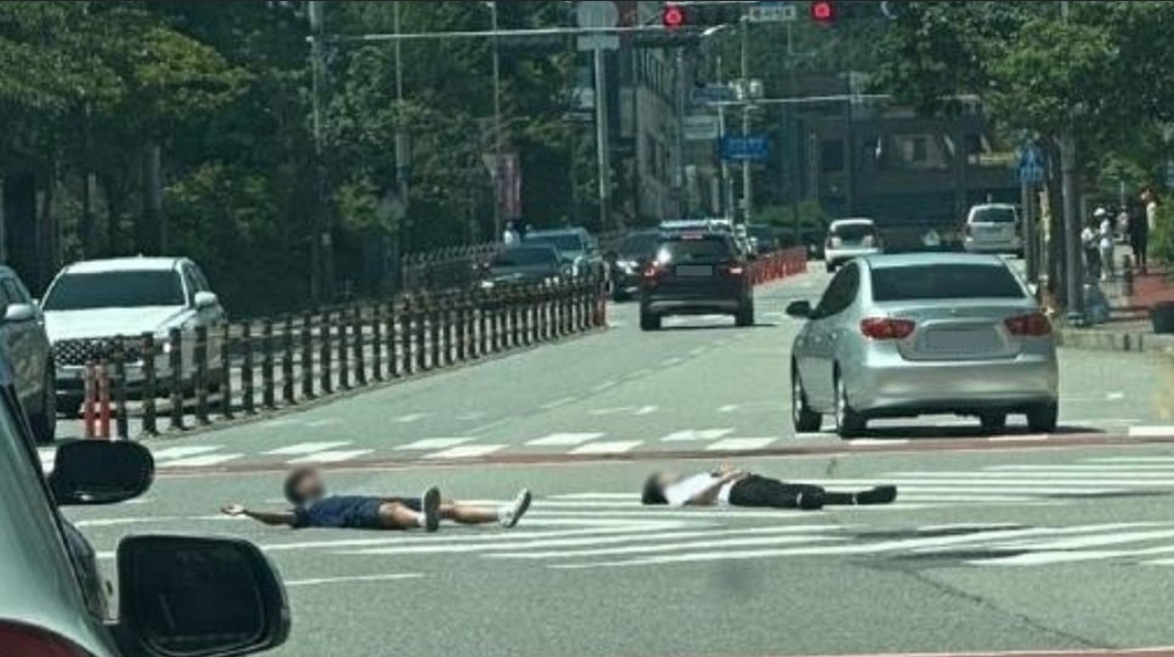 스쿨존서 大자로 뻗어 폰 만지작… 운전자 조롱한 ‘민식이법 놀이’
