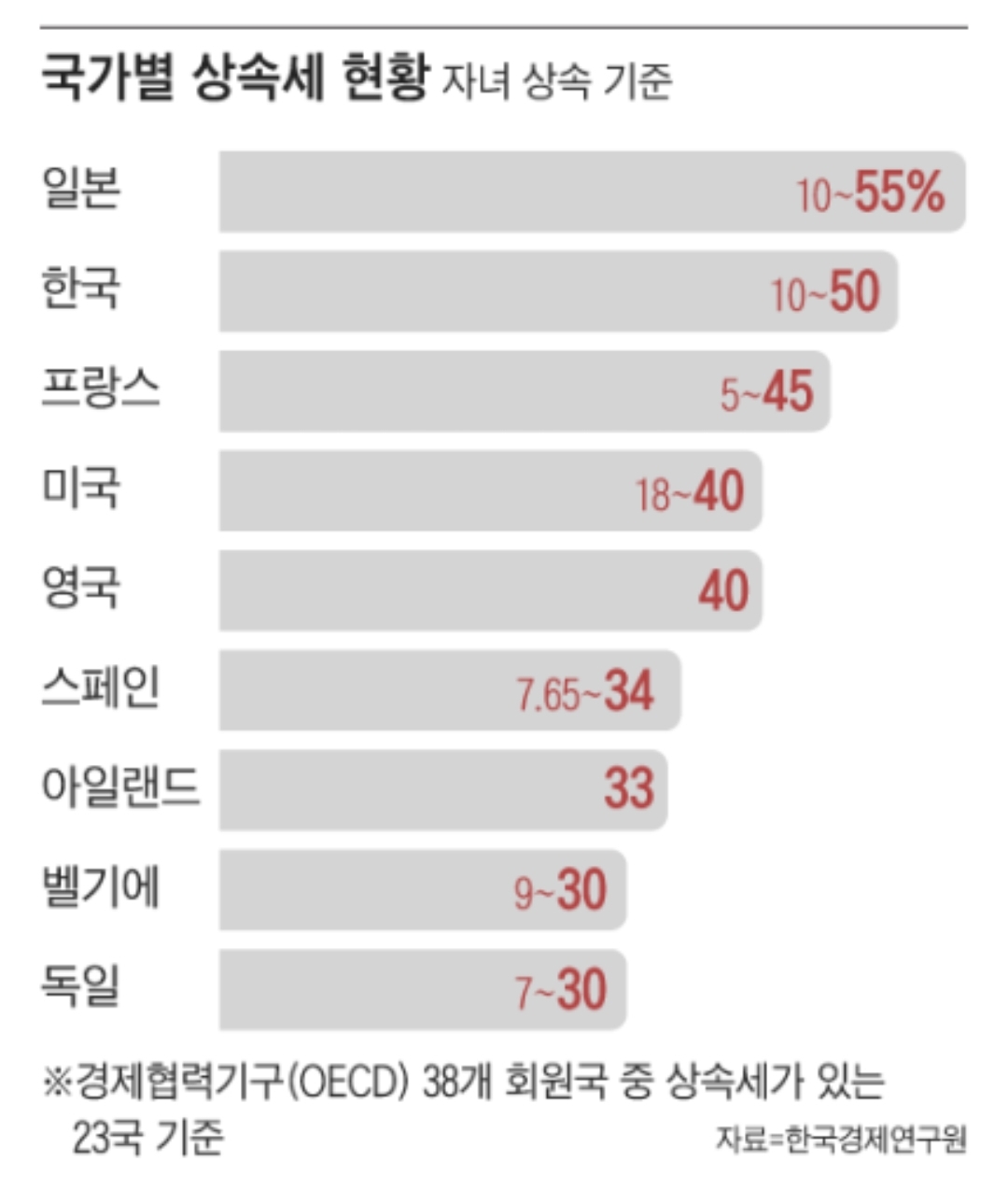 1950년 상속세를 도입한 한국은 10억 원 초과 유산에 대해 최고 55%의 상속세를 매깁니다. 2020년 고(故) 이건희 삼성 회장 사망을 계기로 과도한 상속세에 개편 방안이 검토됐지만 아직 뚜렷한 성과는 없는 상황입니다. 박훈 서울시립대 세무학과 교수는 “과거 대부분 국가는 탈세 등으로 피했던 소득세를 사망 시점에 상속세라는 이름으로 제대로 걷기 위해 제도를 도입했다”며 “투명하고 정확하게 과세가 되는 지금의 현실을 감안하면 명분을 잃은 세금”이라고 했습니다.