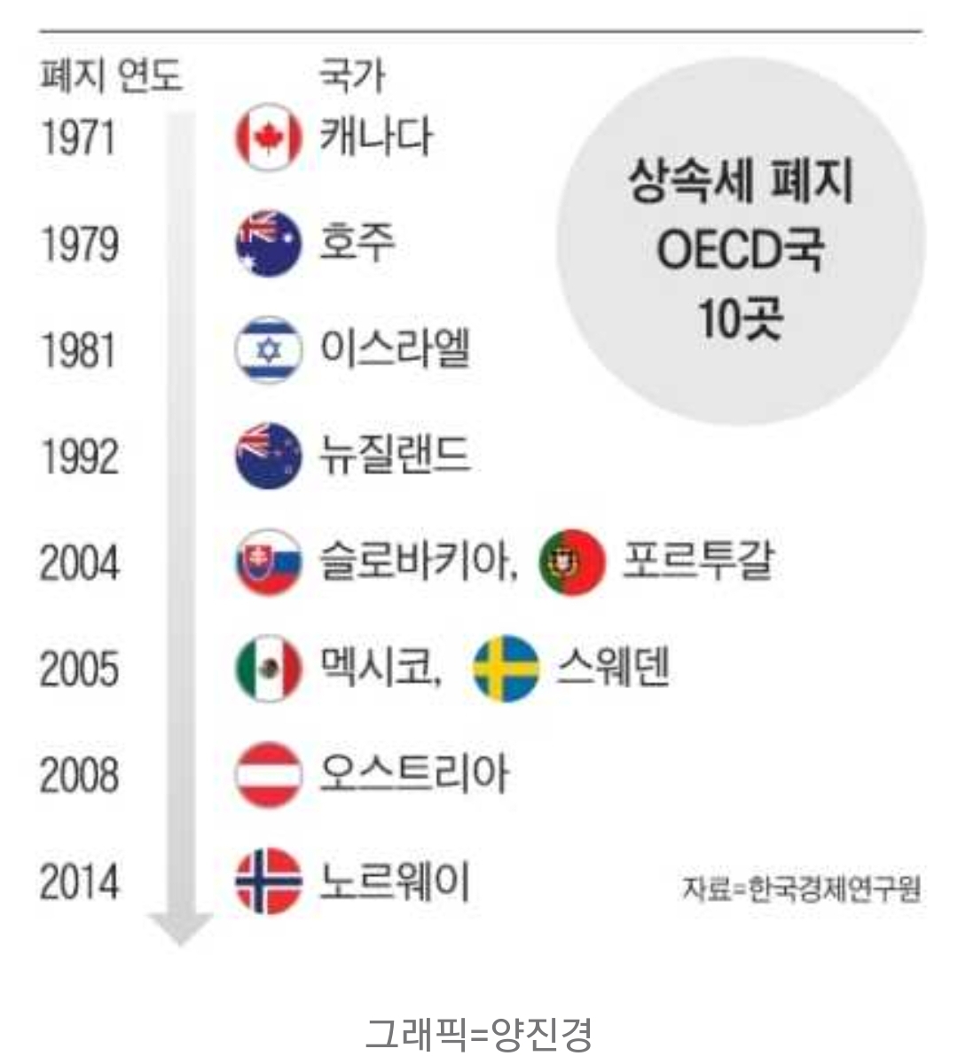 세계적으로 상속세에 대한 인식이 많이 바뀌고 있습니다. 특히 대기업일 경우 그들이 그들이 내는 세금이 수천수만의 사람들이 내는 세금보다 더 많은데, 상속세를 통해 그들의 대물림을 막다 보니 불법적인 상속을 한다거나 타국으로 국부유출이 되기도 합니다. 그러다 보니 이것이 오히려 국가와 당사자들에게 부담이 되고 있는 것이 사실입니다.