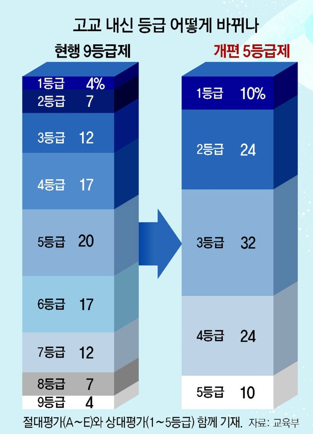 고교 내신 상대평가는 현행 9등급에서 5등급으로 바뀝니다. 모든 학년, 모든 과목에 A∼E등급 절대평가(성취평가)를 도입하고 1∼5등급 상대평가를 학교생활기록부에 함께 표기합니다. 현재는 내신 1등급이 상위 4%까지입니다. 개편안에 따르면 10%까지 확대됩니다. 이는 현재의 1·2등급 누적 비율(11%)과 비슷합니다.