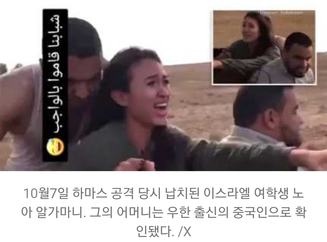 음악 축제에 참여했다가 납치된 이스라엘 여학생 노아 알가마니는 어머니가 중국인인 혼혈로 확인됐습니다. 이스라엘 광저우총영사관 등이 이 소식을 웨이보에 올렸는데, “중국 국적도 없는데 무슨 중국인이냐” “중국 혈연은 언급도 하지 마라” “우리는 팔레스타인을 지지한다”는 등의 댓글이 쏟아졌습니다.