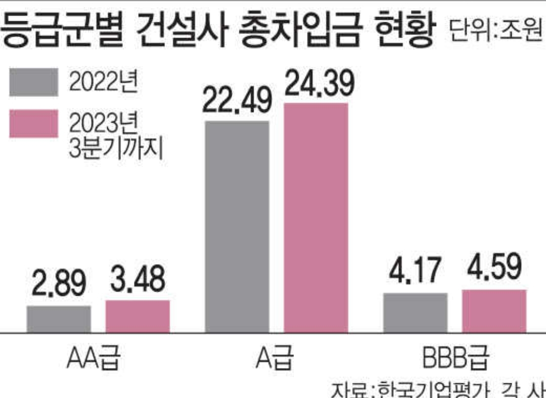 3사가 공통적으로 내년 전망을 어둡게 본 대표적인 업종은 건설입니다. 한국기업평가(한기평)에 따르면 올해 9월 말 기준 국내 건설사 합산 총차입금은 전년 말 대비 10.4% 늘어난 32조 5000억 원을 기록했습니다.