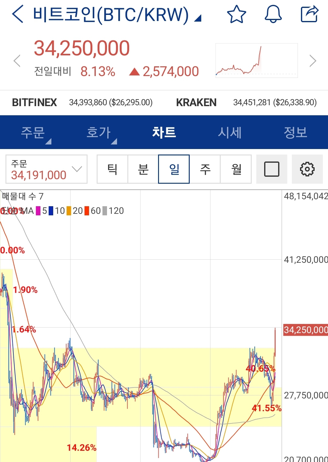 일봉상 차트를 보면 상승의 위에서 누르던 벽을 깼음을 알 수 있지요. 즉 이제는 원화기준 3천2백만원~3천3백만원 선은 강력한 지지선이 되어줄 것입니다.