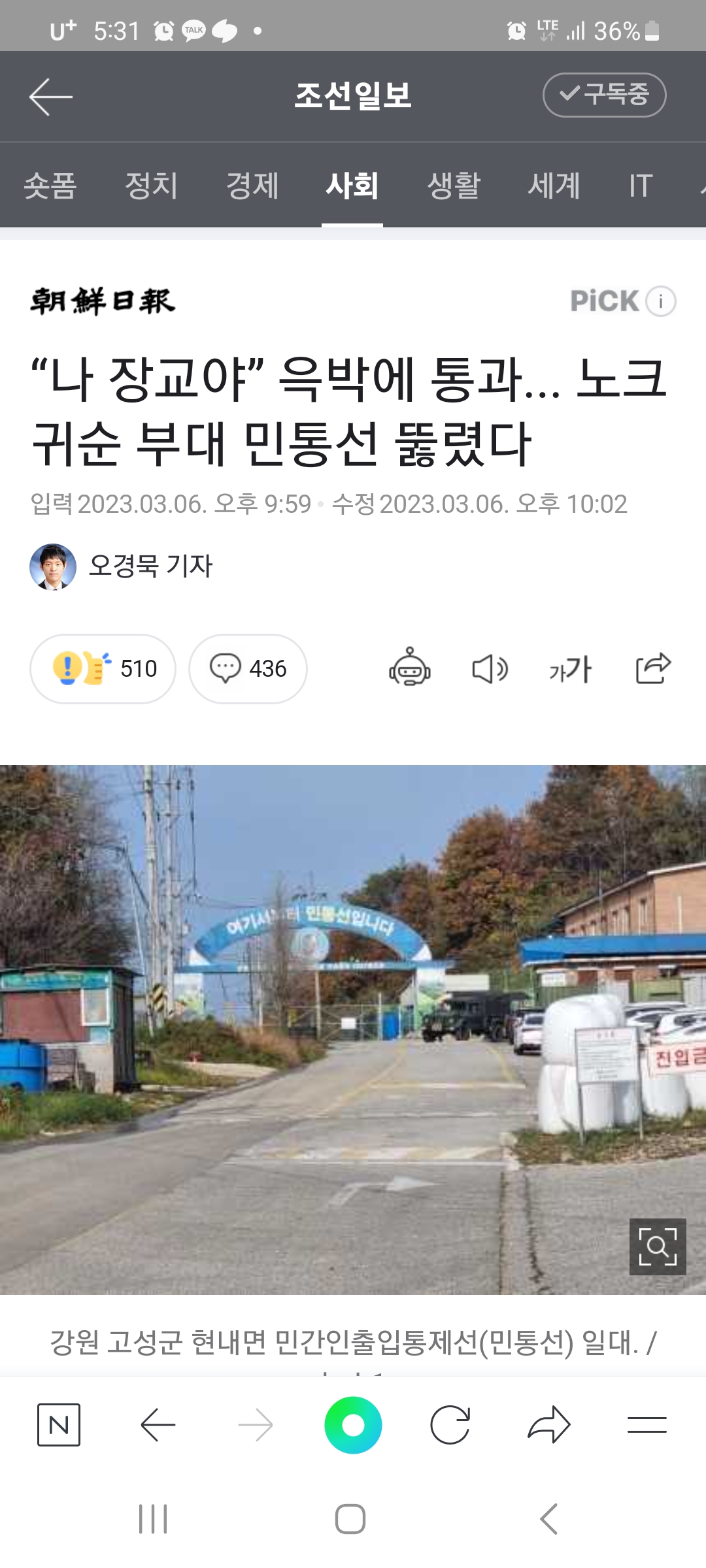 참 어이없는 일이 또 터졌네요... 저부대 부대장은 승진못하겠네요.. 그러닌깐 평상시 저 부대 간부들이 얼마나 개판이었으면, 사병들 군기강이 얼마나 해이하면 저럴까요? 군인들 여러분 당신들 덕분에 우리가 평안하게 살고 있음을 압니다. 하지만 조금만 더 힘냅시다! 다시는 이런일이 안일어나도록 힘냅시다! https://n.news.naver.com/article/023/0003750002?cds=news_edit “나 장교야” 윽박에 통과... 노크귀순 부대 민통선 뚫렸다 장교를 사칭한 민간인이 최전방 민간인 출입 통제선(민통선)을 허가 없이 넘나드는 일이 발생했다. 군 당국의 조사 결과 대공 혐의점은 없는 것으로 드러났지만, 경계 태세를 놓고 비판이 쏟아 n.news.naver.com