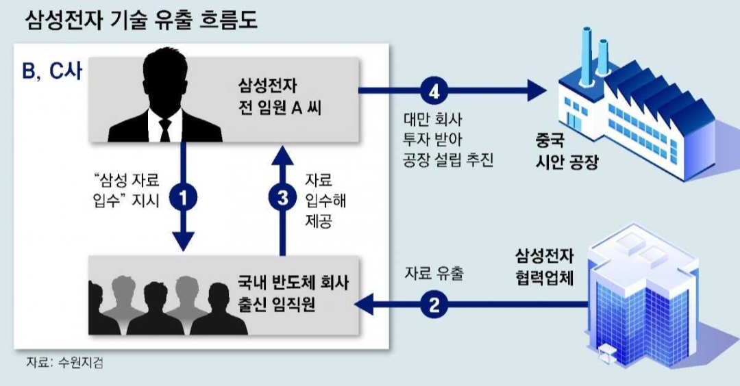 https://n.news.naver.com/article/020/0003503052?cds=news_edit 삼성 반도체 공장 설계 빼돌려 中에 ‘복제 공장’ 시도국가핵심기술로 지정된 삼성전자 반도체 공장 설계자료를 통째로 빼돌려 중국에 ‘짝퉁 공장’을 지으려 한 삼성전자 상무 출신 인사 등이 재판에 넘겨졌다. 검찰은 삼성전자가 이번 기술 유출n.news.naver.com이번에 잡힌 산업스파이는 수율의 달인으로 알려진 삼성전자 상무 출신이며, 하이닉스 전부사장 출신이었던 사람이 중심으로 된 총 7명이었다고 합니다. 이들은 국가핵심기술로 지정된 삼성전자 반도체 공장 설계자료를 통째로 빼돌려 중국에 ‘짝퉁 공장’을 지으려고 하려다 발각되어 재판에 넘겨졌다고 합니다. 검찰은 삼성전자가 이번 기술 유출로 본 ..