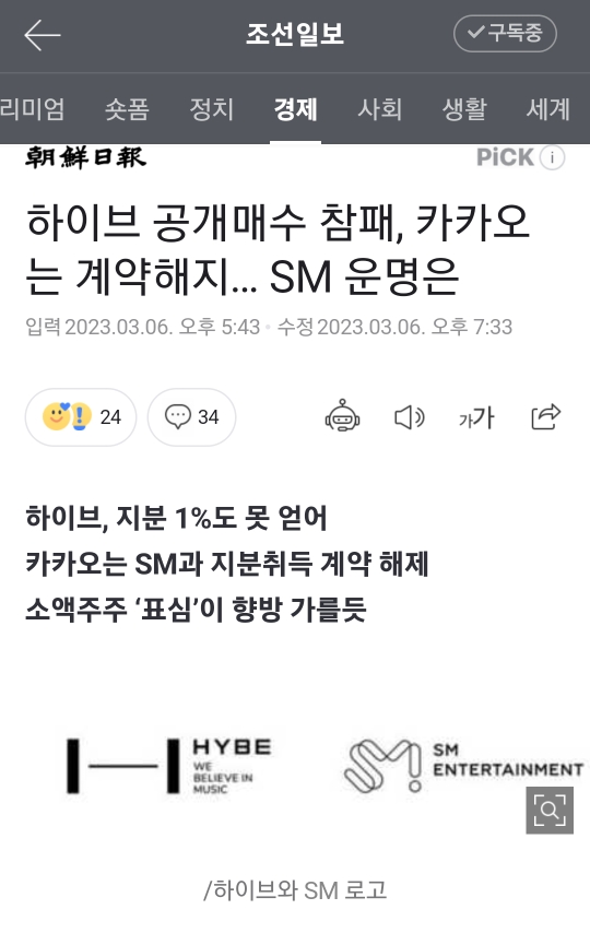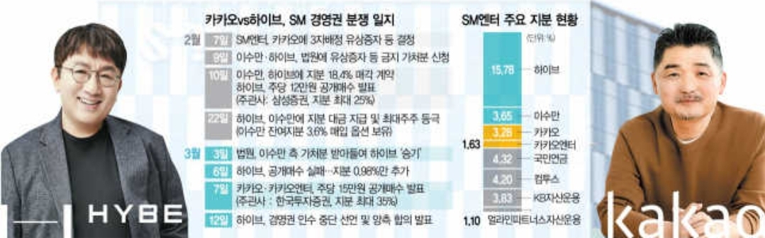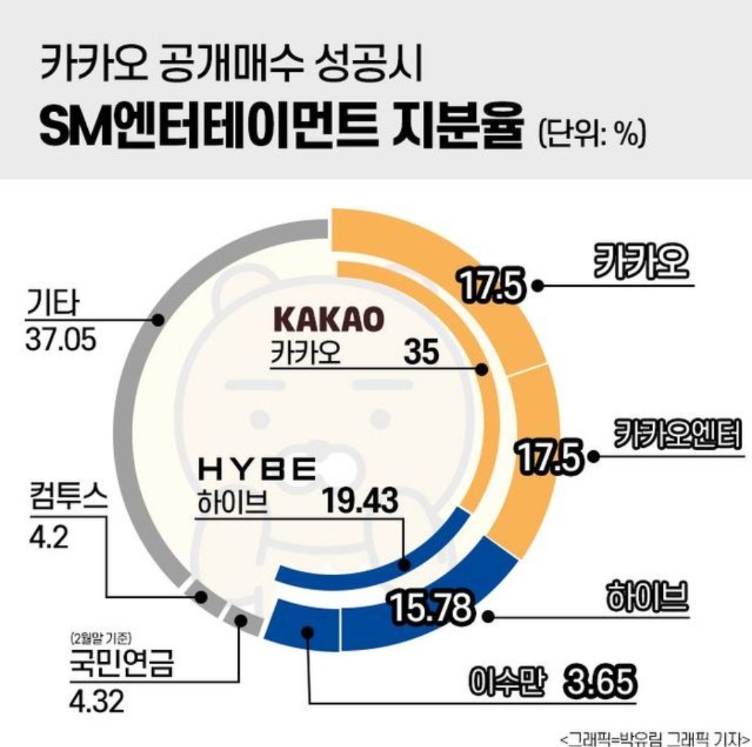 SM을 두고 카카오와 경영권 싸움을 했던 하이브가 자신들이 가지고 있는 지분을 카카오에 판다는 소식입니다. 이렇게 되면 SM으로 인한 경영권을 둘러싼 전쟁을 통해 최대 혜택을 누리는 곳은 하이브가 되겠네요. 물론 방시혁을 욕할 사람들이 많을 거예요. 그런데 카카오와 머니싸움을 할 수준은 안되고, 카카오가 대주주이길 원하는 상황에서 경영권 참여도 없이 SM주식을 가지고 있는 게 아무런 혜택이 없는 게 사실이지요. 카카오 입장에서도 미래적 경쟁자를 대주주로 데리고 가기보다 적당히 돈을 쳐주고 지분을 받아내는 게 보다 안정적인 경영이 가능하니 서로 윈윈 한다 할 수 있습니다. 물론 이 전쟁이 카카오가 SM을 적은 돈 들여서 먹으려고 하다가 이수만의 반발을 사면서 시작된 거예요. 이수만도 적절한 보상을 받고 팔..